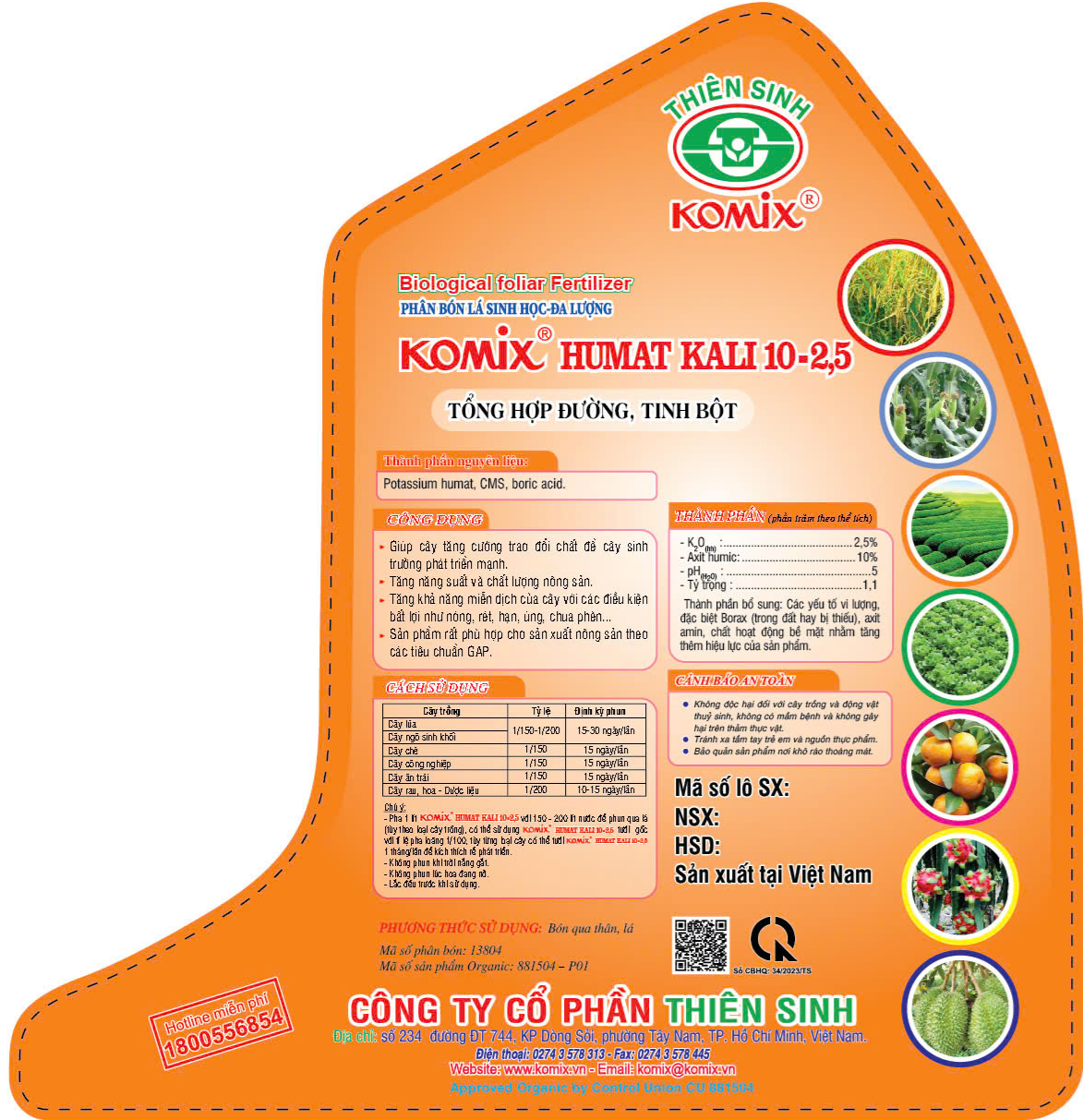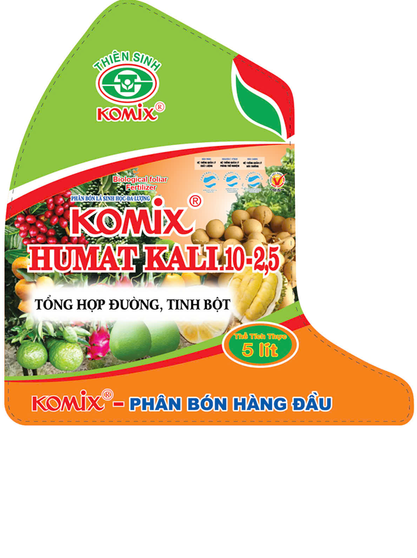 - Pha 1 lít KOMIX HUMAT KALI 10-2,5 với 150 - 200 lít nước để phun qua lá (tùy theo loại cây trồng), có thể sử dụng KOMIX HUMAT KALI 10-2,5 tưới gốc với tỷ lệ pha loãng 1/100, tùy từng loại cây có thể tưới KOMIX HUMAT KALI 10-20 1 tháng/lần để kích thích rễ phát triển.