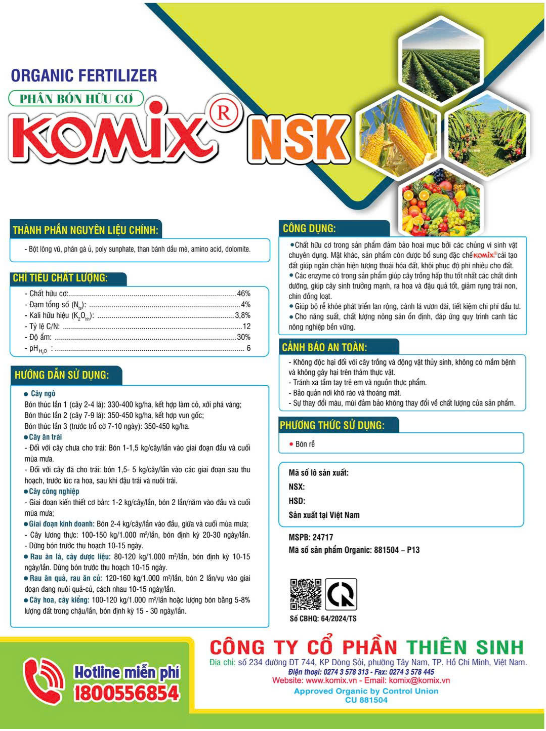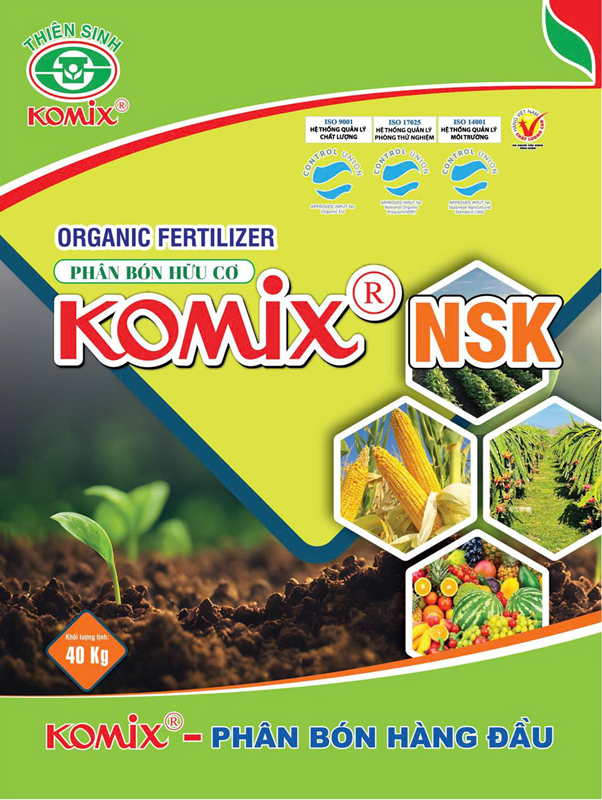 - Chất hữu cơ trong sản phẩm đảm bảo hoai mục bởi các chủng vi sinh vật chuyên dụng. Mặt khác, sản phẩm còn được bổ sung đặc chế KOMIX cải tạo đất giúp ngăn chặn hiện tượng thoái hóa đất, khôi phục độ phì nhiêu cho đất.