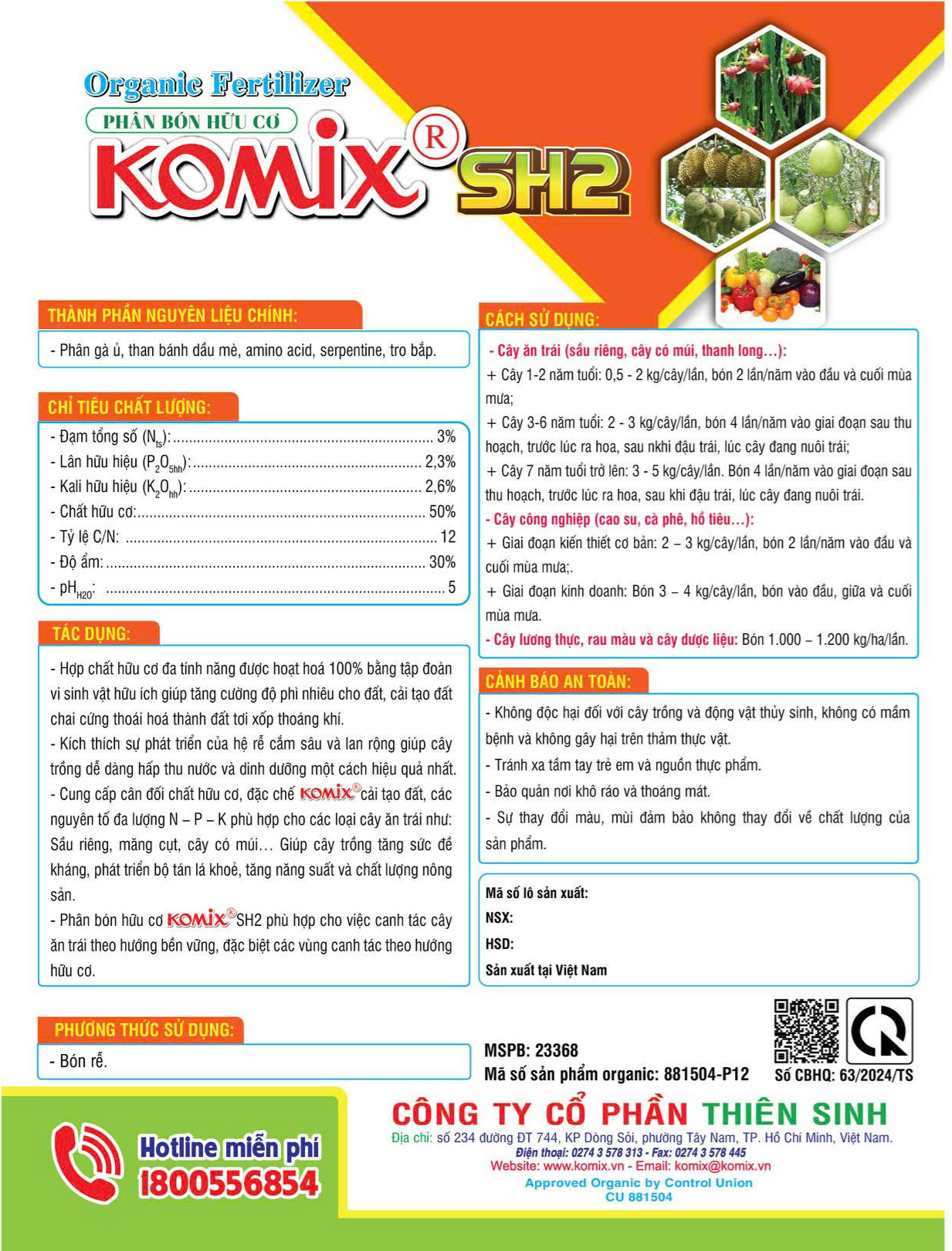 - Phân bón hữu cơ Komix. SH2 phù hợp cho việc canh tác cây ăn trái theo hướng bền vững, đặc biệt các vùng canh tác theo hướng hữu cơ.